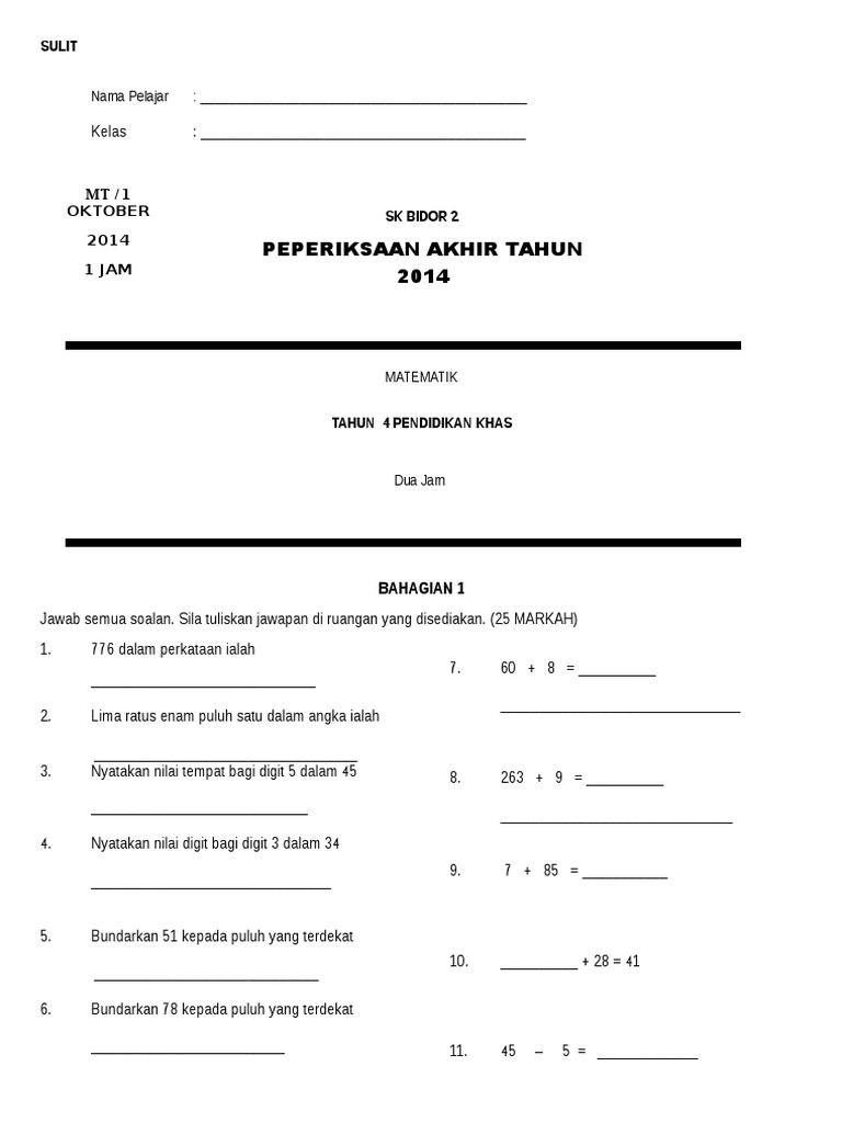 Koleksi soalan ini diperoleh dari group koleksi soalan maaf andai ada yang kurang. Sk semambu peperiksaan akhir tahun program integrasi pendidikan khas pipk masalah pembelajaran oktober 2012 matematik nama murid. PEPERIKSAAN PPKI PENDIDIKAN SAINS SOSIAL DAN ALAM SEKITAR TAHUN 4.